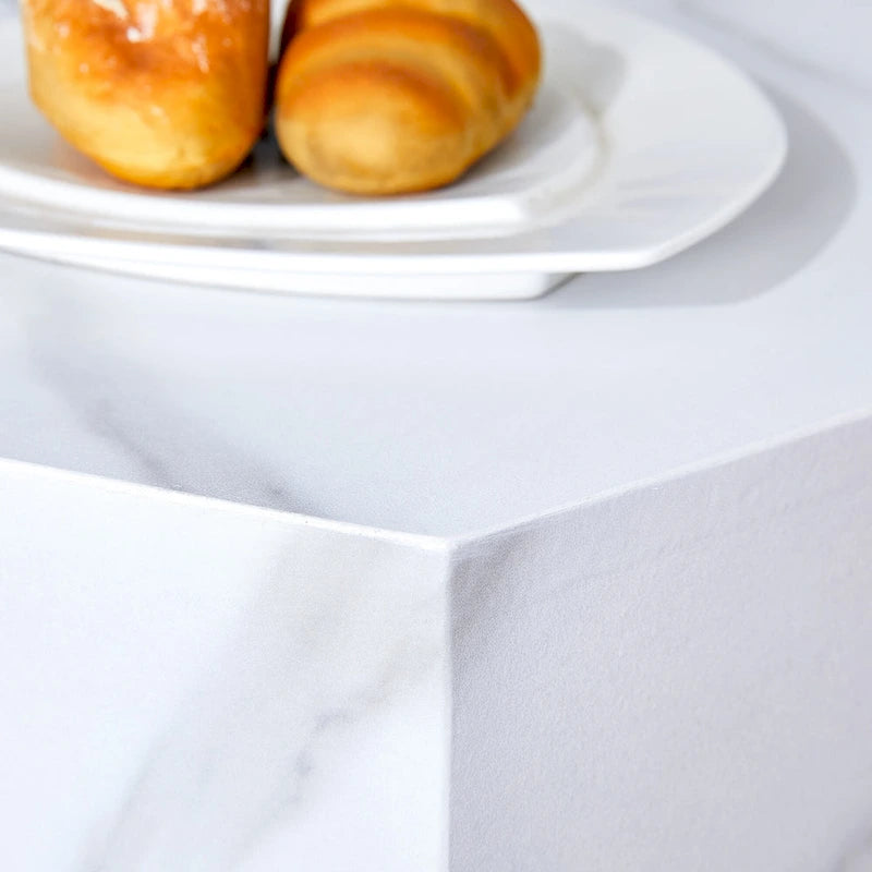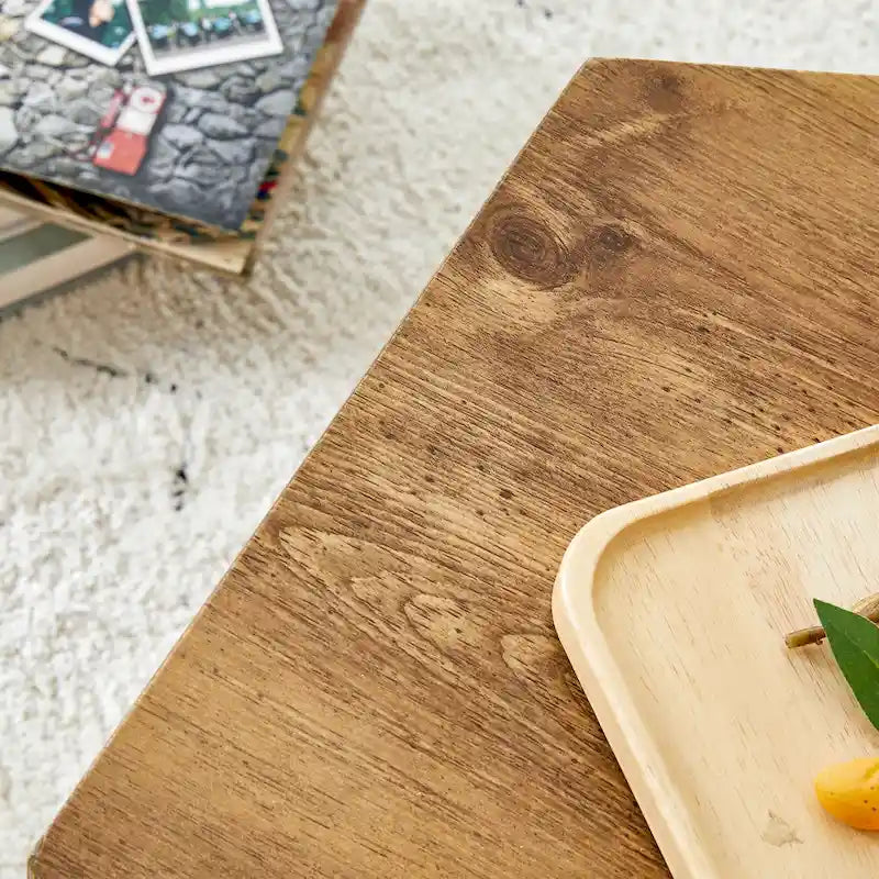 Table basse hexagonale texturée avec patins antidérapants, idéale pour les petits espaces de salon.