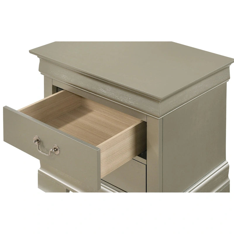 La table de chevet Louis Philippe à deux tiroirs de Glory Furniture présente de magnifiques bords festonnés et une quincaillerie raffinée, dans un style traditionnel. Sa structure est en bois, composée de panneaux de particules et de placage en bois véritable. Les tiroirs coulissent en douceur grâce à des glissières métalliques robustes et leur assemblage à queue d'aronde assure une grande durabilité. Des équerres de renfort soutiennent efficacement le fond des tiroirs. Livrée entièrement assemblée, cette table de chevet est prête à l'emploi.